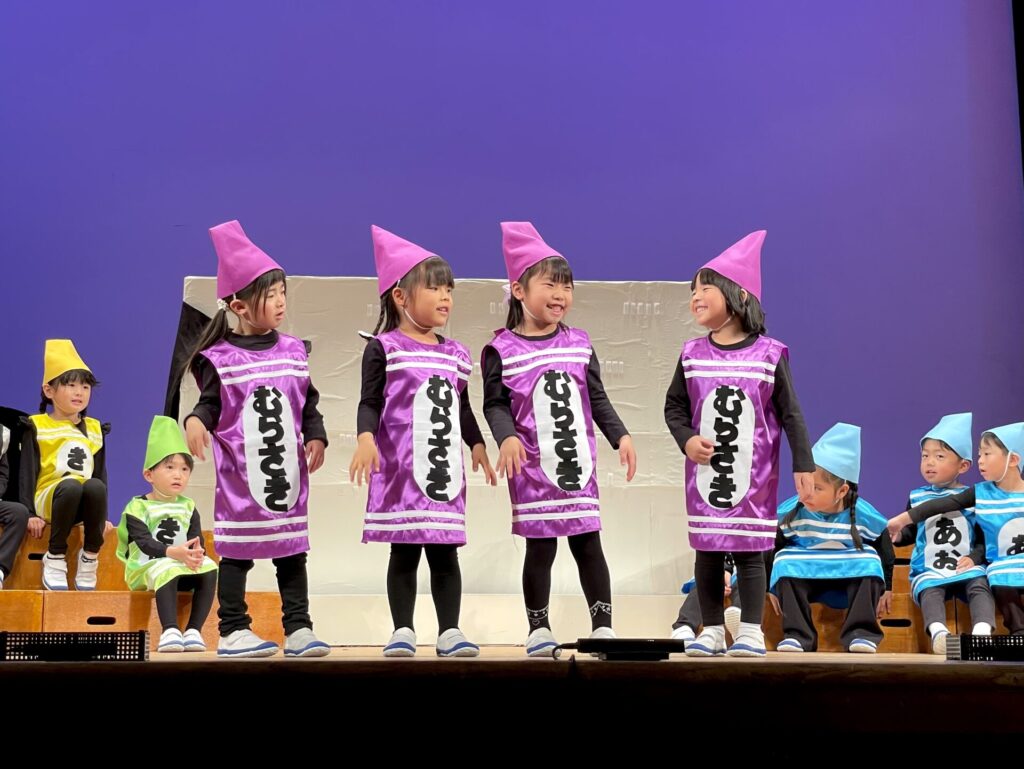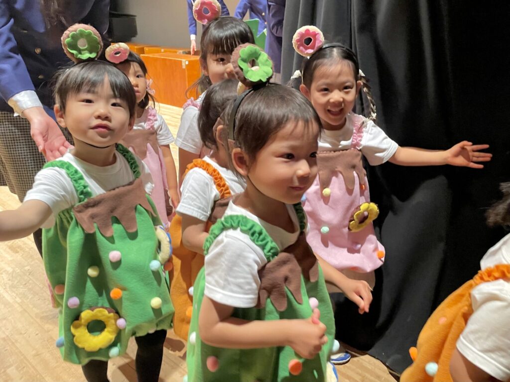 劇や劇あそびの演目では、それぞれが役になりきりとっても素敵な姿を見せてくれましたね🌟子どもたちが興味を持っている遊びやお気に入りの絵本などを題材にしながら、どのクラスもこどもたちのアイディアや想いが詰まったオリジナルストーリーを作り上げてきました😊お話の内容を理解して、身振りをつけながら自分のセリフを表現することに難しさを感じていた子もいましたが、練習を重ねていく内に自信がつき堂々と演じられるようになっていきました😊笑顔で舞台に立つみんなの姿からおともだちと協力して劇を作っていく楽しさが伝わってきました🌟